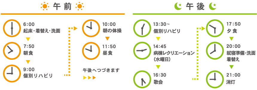 入院生活そのものがリハビリと考え、早期の家庭・社会復帰を目標に計画を立てます。 リハビリテーションは年間365日行なっています。食事は食堂または自室で皆さんで召し上がっていただきます。体操やレクリエーションの時間もあります。